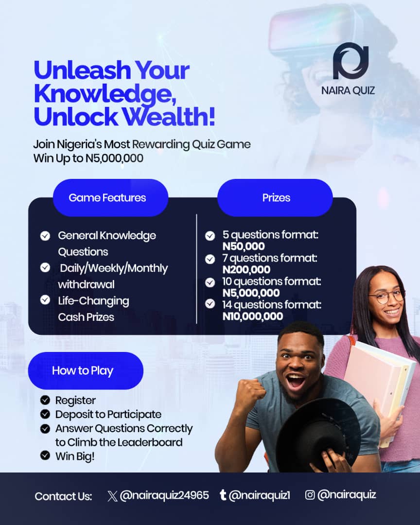 Learn more...NairaQuiz is an online quiz game platform where players can compete to win cash prizes.